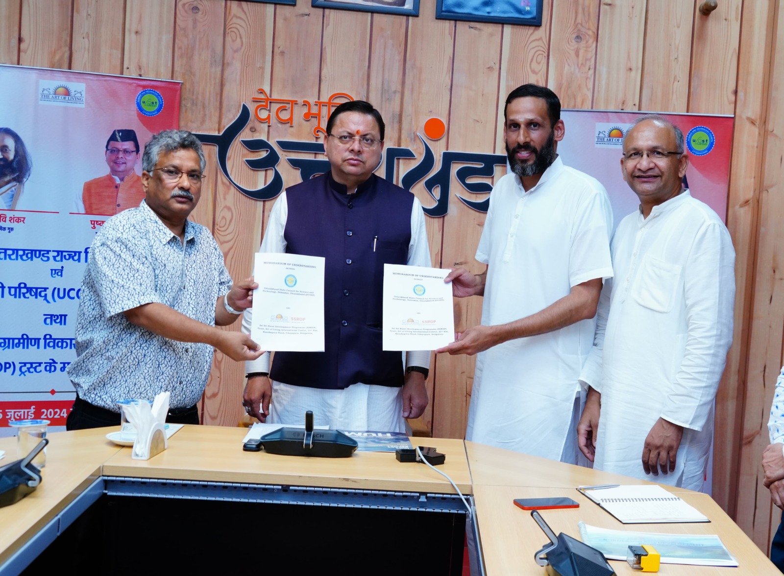 देहरादून । प्रदेश के ग्रामीण स्कूलों में 04 किलो वाट के सोलर पैनल एवं मॉर्डन क्लास रूमों का निर्माण श्री श्री ग्रामीण विकास परिजनों ट्रस्ट ( SSRDP ) द्वारा किया जाएगा। इस संबंध में शुक्रवार को सायं मुख्यमंत्री आवास में मुख्यमंत्री पुष्कर सिंह धामी की उपस्थिति में यूकॉस्ट के महानिदेशक प्रो. दुर्गेश पंत तथा ऑर्ट ऑफ लिविंग एवं SSRDP के प्रतिनिधि दीपक शर्मा के मध्य एमओयू हस्ताक्षरित किया गया।