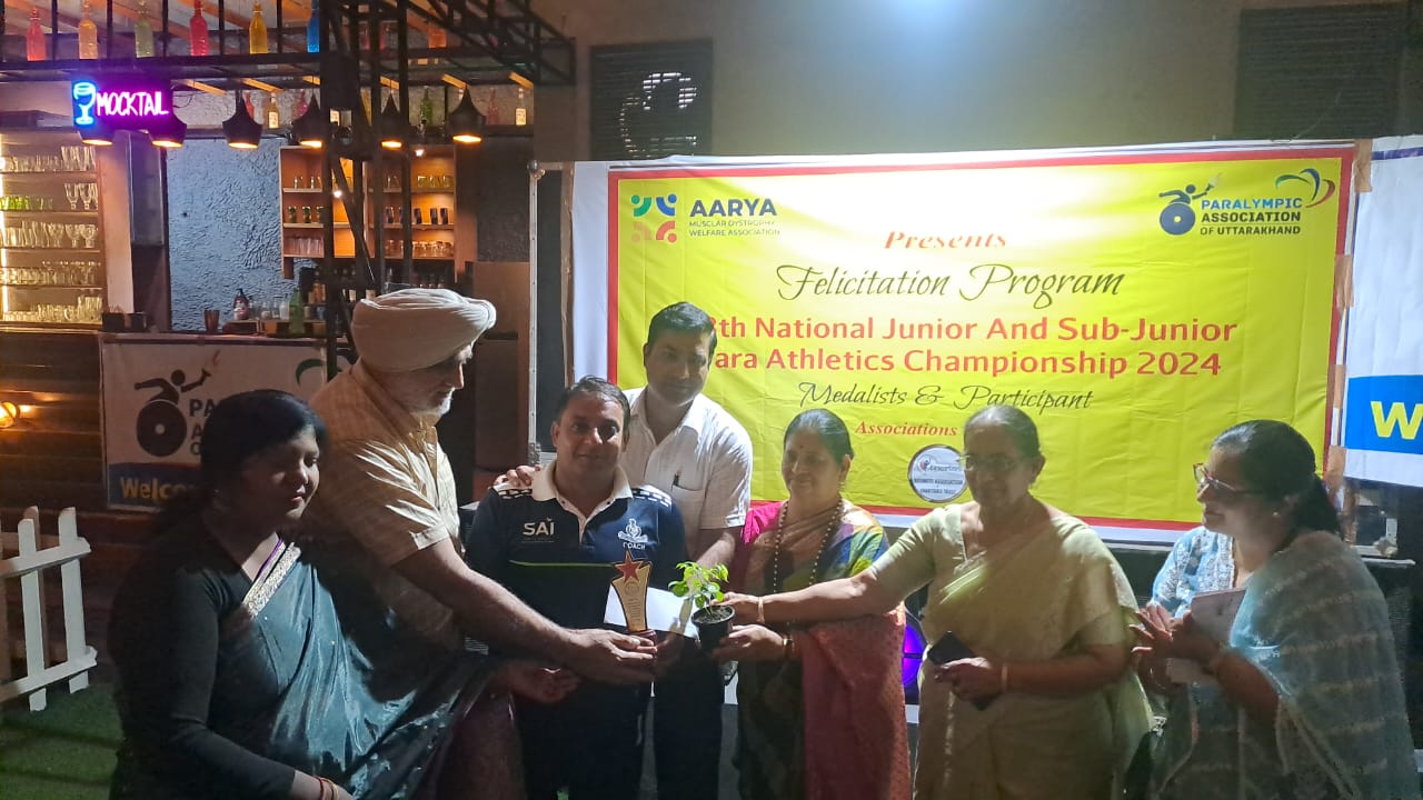 13 वीं नेशनल पेरा खिलाडियो सब जूनियर खिलाडियो में कांन्तिरावा स्टेडियम में आयोजित उत्तराखंड की टीम में 8 जूनियर पैरा खिलाड़ियों ने प्रतिभाग किया। इनमें भारती अग्रवाल हरिद्वार से गोला फेंक फेक चक्का फेंक गोल्ड मेडल व सिल्वर मेडल मिला माणिक सिल्वर मेडल गौरवब्राउन मेडल किया प्रतिभागी खिलाडी आर्यन आनन्द को सभा की आर्य हरिद्वार गोला चरका में मटर की ब्राउन मेडल और दीपाशु कुमार, रजत कुमार ने मेडल जीत कर उत्तराखंड का नाम रोशन किया आज इनको सम्मानित करने के लिए आयोजित कार्यक्रम में बतौर मुख्य अतिथि कैंट विधानसभा से विधायक सविता कपूर सहित राज्य मंत्री विनोद उनियाल व पूर्व राज्य मंत्री रविंद्र आनंद मौजूद रहे। आर्यन मस्कुलर डिस्ट्रॉफी वेलफेयर एसोसिएशन ने सभी को स्मृति चिन्ह एवं नगद पुरस्कार देकर सम्मानित किया। खिलाड़ियों सहित इस मौके पर कोच भारत कुमार आदेश डबराल सन्दीप चौधरी व टीम मैनेजर कुलदीप सिंह जोनी कुमार को भी सम्मानित गया इस मौके पर पैरालंपिक संगठन का उत्तराखंड के अध्यक्ष जेएस , सचिव अमिता सिंहउ पाध्यक्ष – उमेश ग्रोवर पवन कुमाराव कोच प्रेम कुमार साथ में गीतिका आनन्द आरायन वेल्फायर संगठन सेक्रेट्री राहुल आनंद का आशीष जैन शलभ जैन गौरव नागपाल सुमित गुप्ता आकाश मित्तल मौजूद रहे वही कार्यक्रम संचालन प्रिया गुलाटी ने किया।